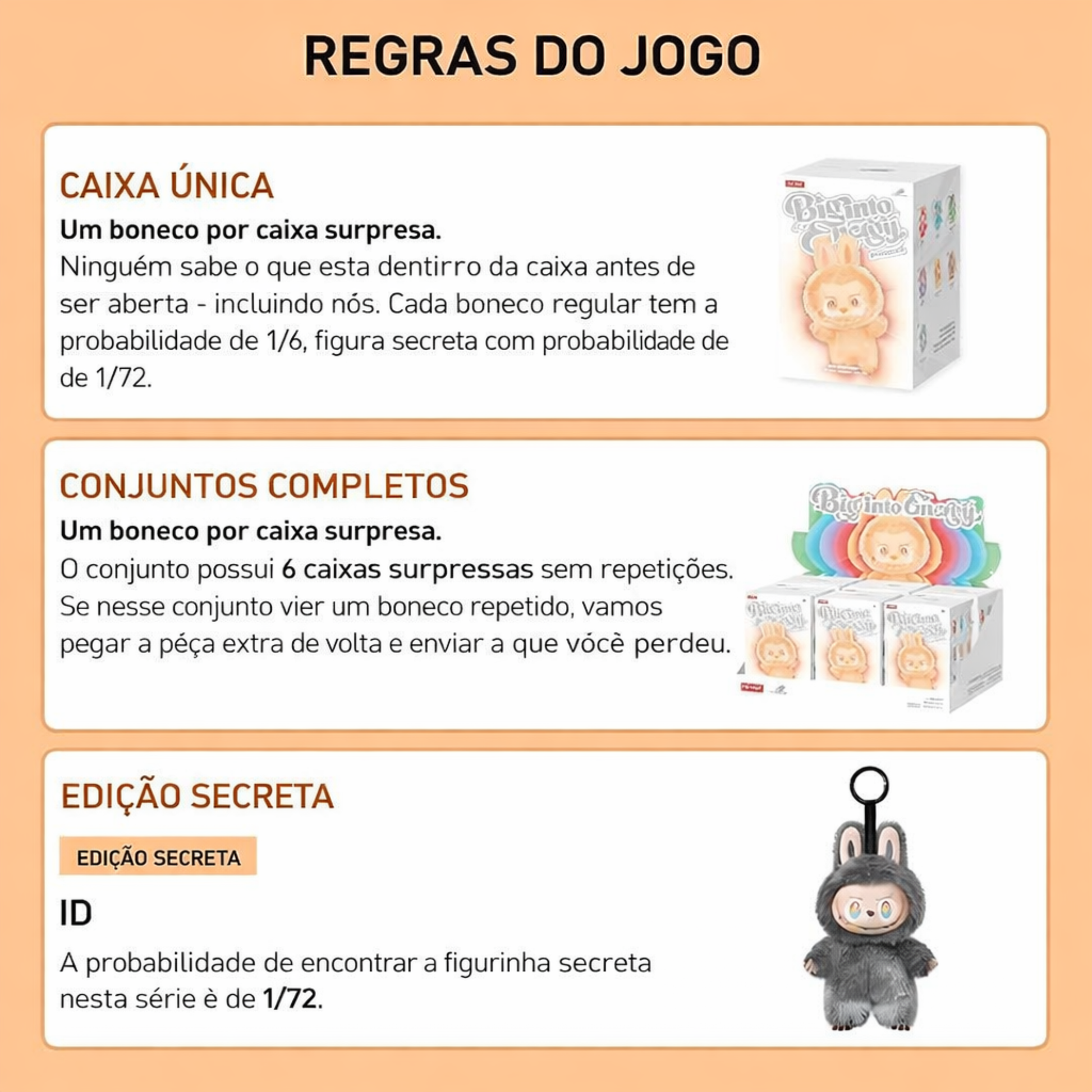 As caixas surpresa são totalmente aleatórias e não podemos aceitar pedidos de personagens específicos.